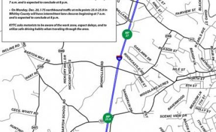 The Kentucky Transportation Cabinet (KYTC) advises motorists that resurfacing operations will be conducted on portions of I-75 northbound and southbound in Whitley County on Monday, Dec. 20. The work schedule is listed below: On Monday, Dec. 20, I-75 southbound traffic at mile...