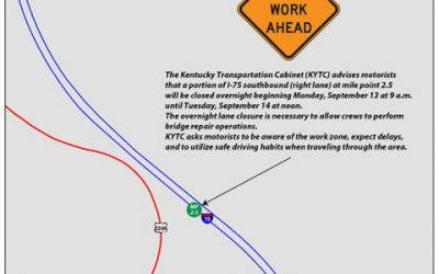 The Kentucky Transportation Cabinet (KYTC) advises motorists that a portion of I-75 southbound (right lane) at mile point 2.5 will be closed overnight beginning today, Sept. 13 at 9 a.m. until Tuesday, Sept. 14 at noon. The overnight lane closure is necessary to allow crews to...